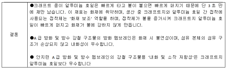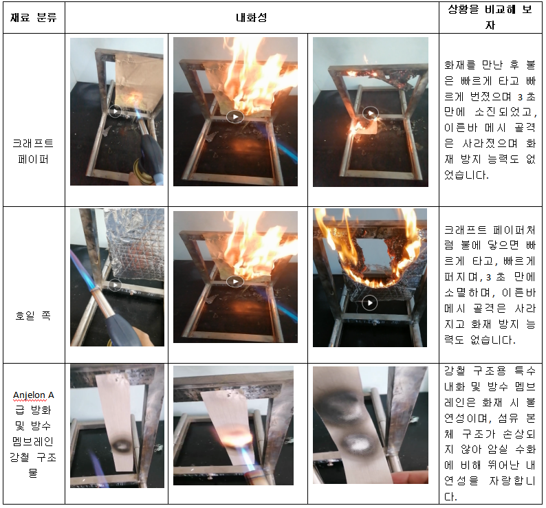 부록 2: 강철 구조물용 크래프트지 알루미늄 호일과 Angelan A급 방화 및 방수 멤브레인의 '내화성' 성능 비교